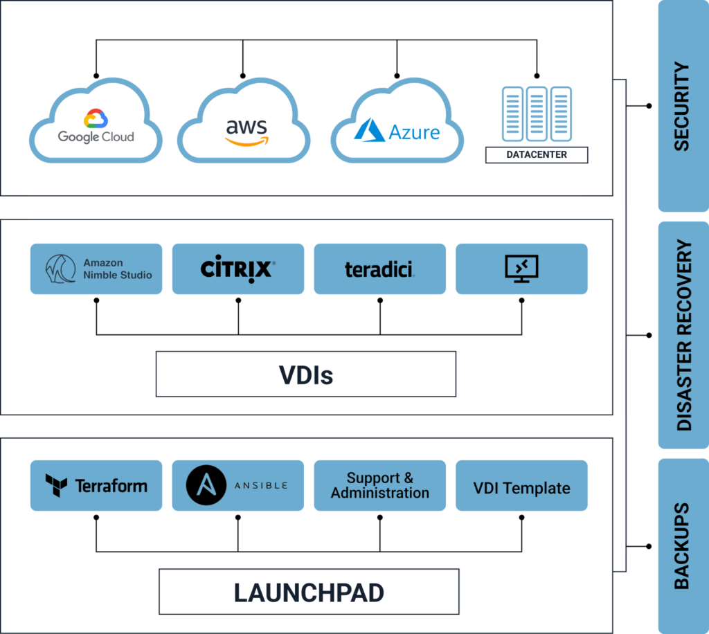 An automated deployment solution built using Terraform and Ansible to deploy VDI to any Cloud using your choice of technology. This could mean many options such as Citrix, Teradici, Remote Desktop Services, Azure Virtual Desktop, and AWS Nimble Studio. We are not only cloud agnostic; we are tools agnostic as well. We provide value rather than tools or technology, or cloud services to our customers.